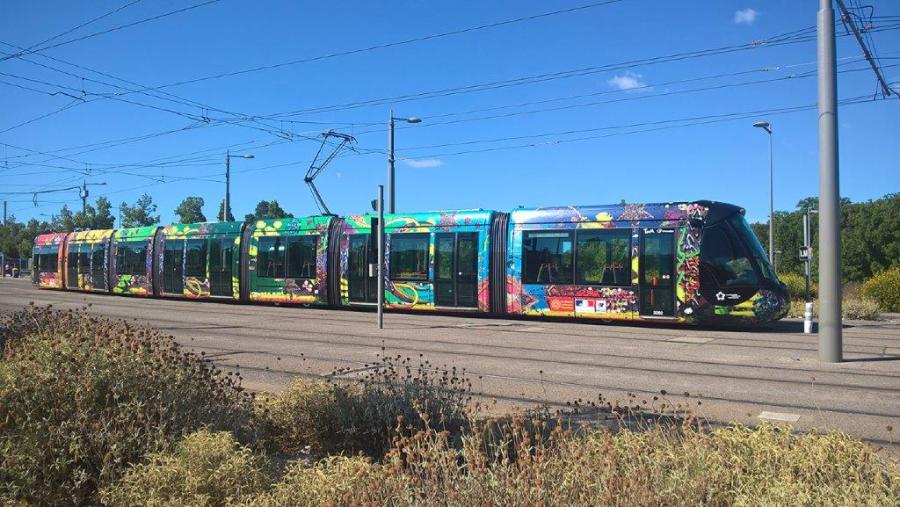 La rame 2082 Citadis 402 Alstom, opérant sur la ligne 3, est photographiée sur une voie en tiroir de la station « Mosson », le samedi 13 juillet 2019. Copyright : Edouard Paris