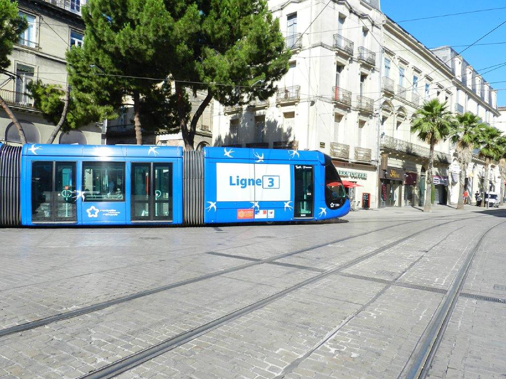 La rame 2092 Citadis 402 Alstom est photographiée sur la place Edouard-Adam à Montpellier, alors qu’elle opère exceptionnellement sur la ligne 3, au moment où elle entame le grand tour du centre-ville, le lundi 15 juillet 2019. Copyright : Anje34