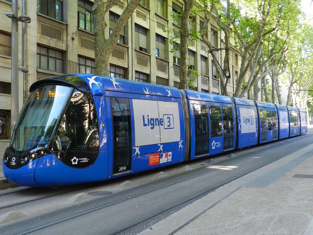 La rame 2090 Citadis 402 Alstom est photographiée sur le boulevard Henri IV à Montpellier, alors qu’elle opère exceptionnellement sur la ligne 3, au moment où elle marque l’arrêt à la station « Albert 1er – Cathédrale » de la ligne 4, le lundi 15 juillet 2019. Copyright : Anje34