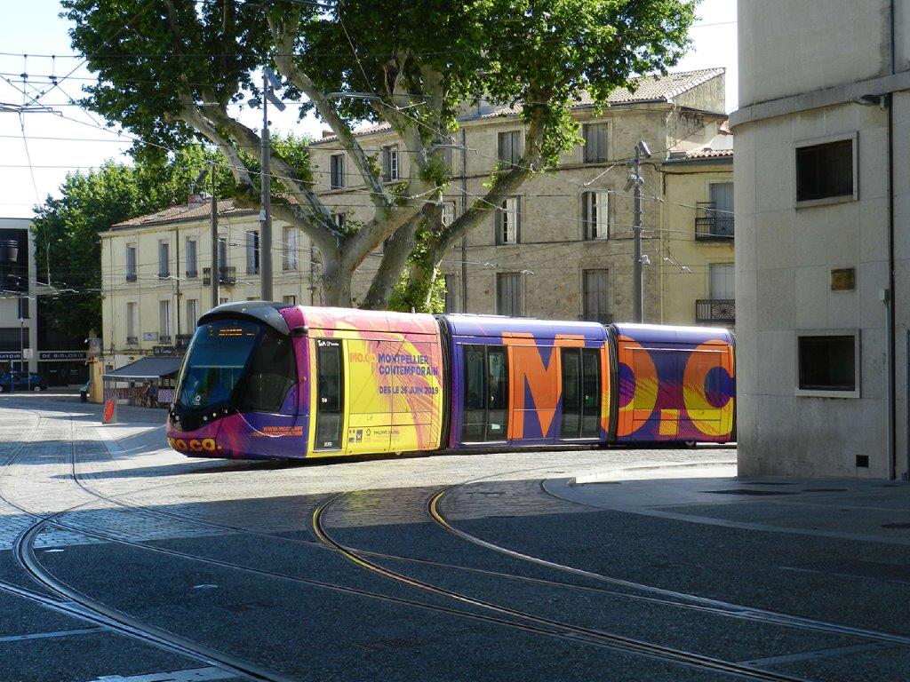 La rame 2099 Citadis 402 Alstom multiligne à la livrée « MOCO » est photographiée sur la place Albert 1er à Montpellier alors qu’elle opère sur la ligne 3 dont l’itinéraire est modifé en centre-ville. Photo prise le lundi 15 juillet 2019. Cophyright : Anje34