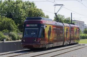 - La rame 103 Tanglo Stadler rhônexpress, assurant la promotion de la version 3D du film « Le Roi Lion » et circulant en direction de « Lyon Gare Part-Dieu,- Villette », est photographiée au moment de son passage sans marquer l’arrêt à la station « Meyzieu Gare » de la ligne 3 du réseau de tramways lyonnais, le dimanche 14 juillet 2019. Copyright : Yvon Brument