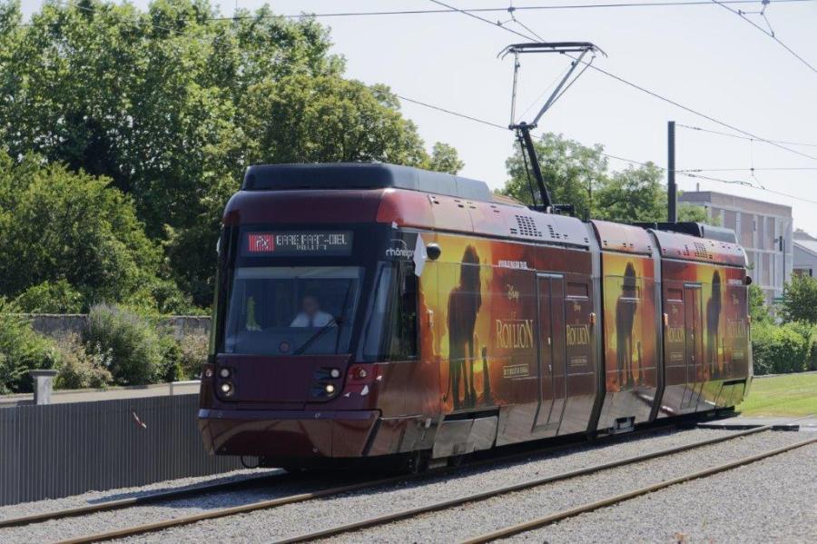 16 juillet 2019 – A Lyon, la rame 103 Tango Stadler rhônexpress assure la promotion de la version 3D du film « Le Roi Lion »