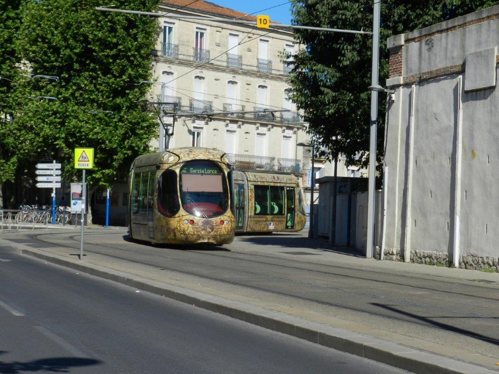 Une rame Citadis 302 Alstom, opérant sur la ligne 4 dans le sens 4b, est photographiée à l’angle du boulevard de Strasbourg et de la rue du Pont-de-Lattes à l’approche de la station « Place Carnot » propre à la ligne 3, le mardi 16 juillet 2019. Copyright : Anje34