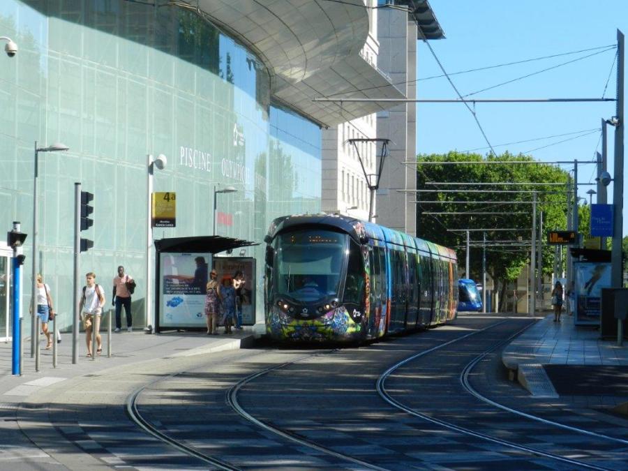 Une rame Citadis 402 Alstom, opérant sur la ligne 3, est photographiée à la station « Place de l’Europe » commune aux lignes 1 et 4, le mardi 16 juillet 2019. Copyright : Anje34