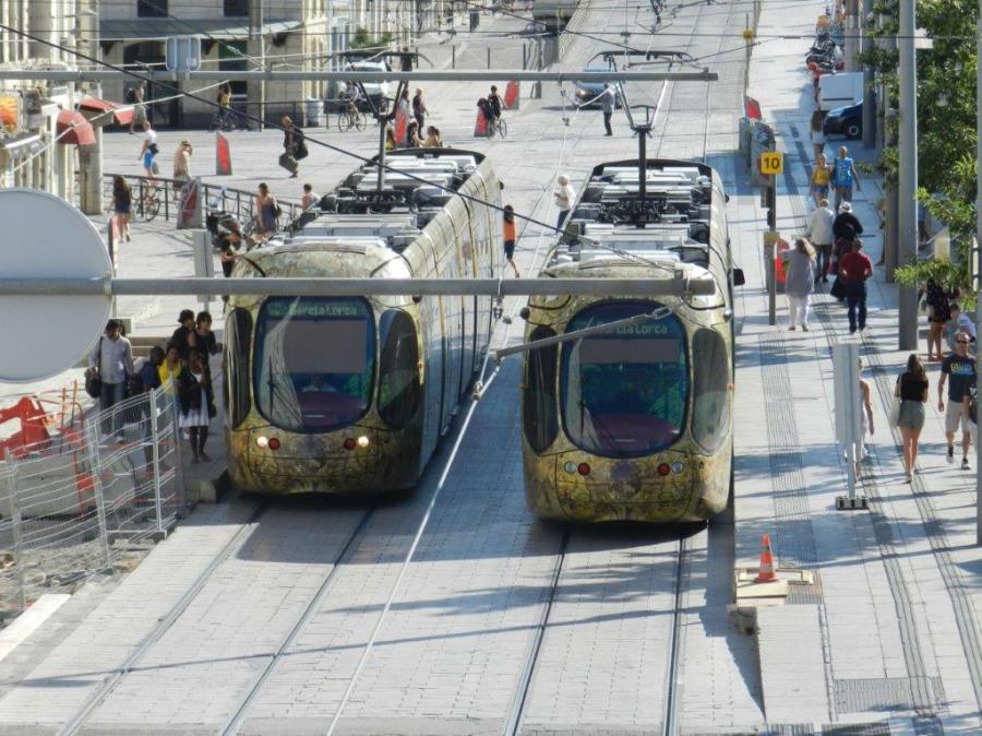 Travaux de réfection du revêtement de la plateforme du tramway entre les stations « Gare Saint-Roch » (rue de la République) et « Observatoire » oblige, les rames de la lignes 4 marquent l’arrêt à la station de secours « Gare Saint-Roch », rue Jules-Ferry à Montpellier. Photo prise le lundi 15 juillet 2019. Copyright : Anje34