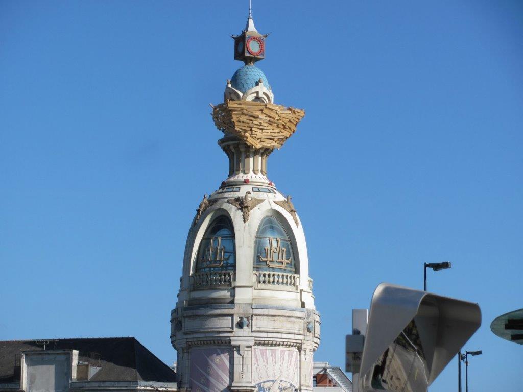 Un nid de l’artiste japonais Tadashi Kawamata posé sur l’emblématique tour LU du Lieu Unique à Nantes. Photo prise le vendredi 19 juillet 2019. Copyright : Edouard Paris