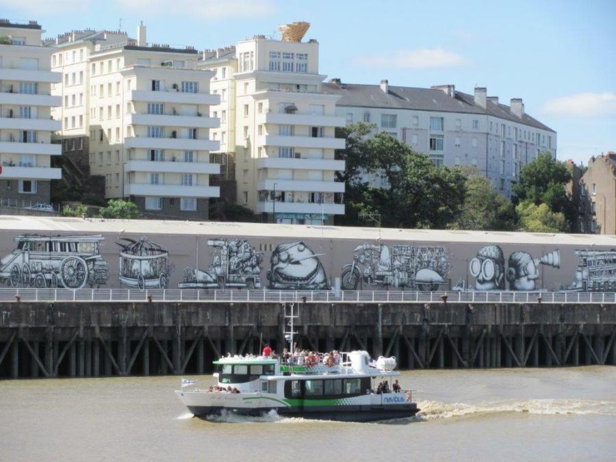 Au premier plan de la photo une navette fluviale Navibus Tan, au deuxième plan une grande fresque murale et au troisième plan un nid oeuvre de l’artiste japonais Tadashi Kawamata posé au sommet d’une résidence nantaise. Photo prise le vendredi 19 juillet 2019. Copyright : Edouard Paris