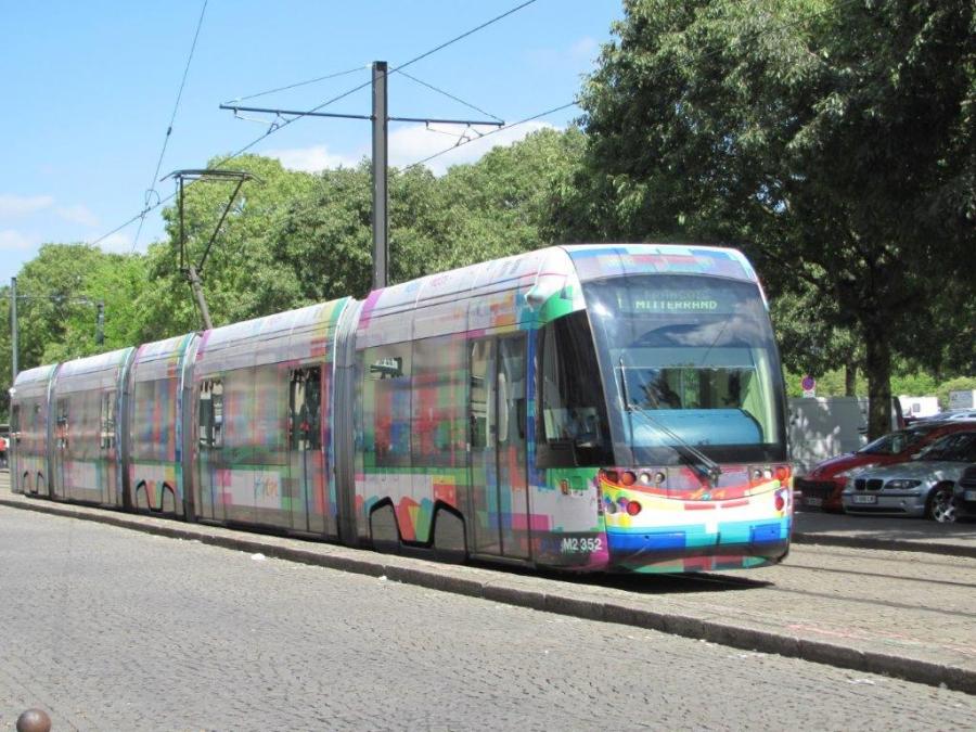 A Nantes, la rame 352 Incentro ADtranz sert de support à l’oeuvre dénommée « Autoscopia » de l’artiste Benoît-Marie Moriceau. Photo prise le vendredi 19 juillet 2019 sur la ligne 1 à deux pas de la station « Médiathèque ». Copyright : Edouard Paris