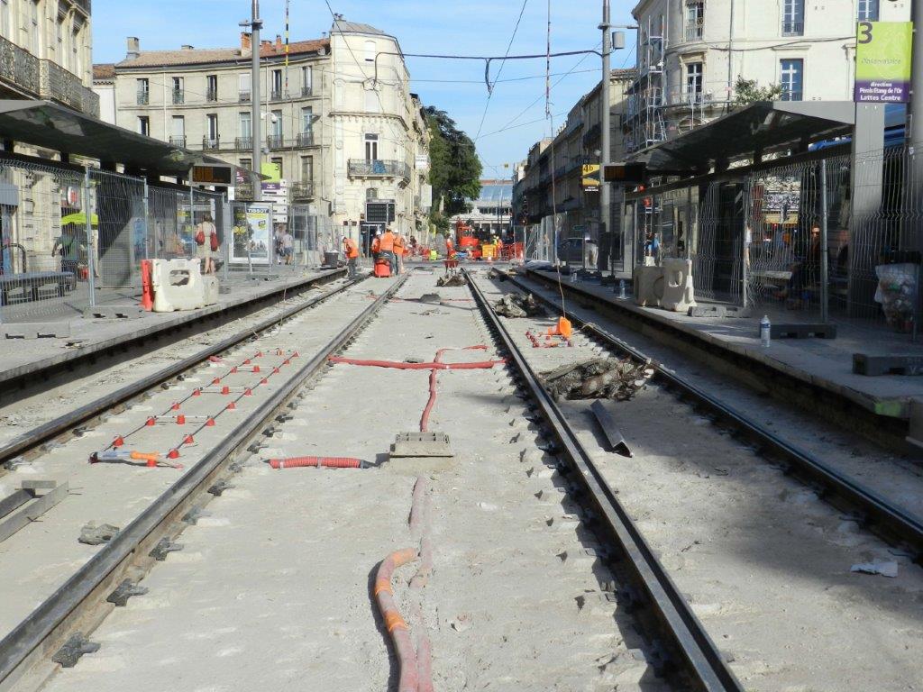 Station « Observatoire » commune aux lignes 3 et 4 de tramway, aperçu du chantier après dépose du revêtement de la plateforme, le jeudi 18 juillet 2019. Copyright : Anje34