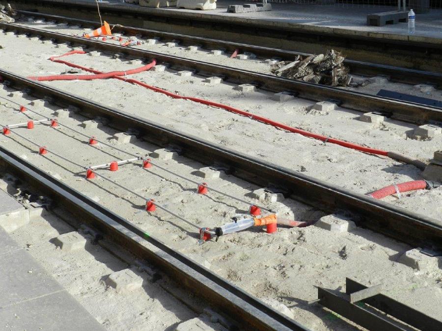 Station « Observatoire » commune aux lignes 3 et 4 de tramway, gros plan sur les voies après dépose du revêtement de la plateforme, le jeudi 18 juillet 2019. Copyright : Anje34
