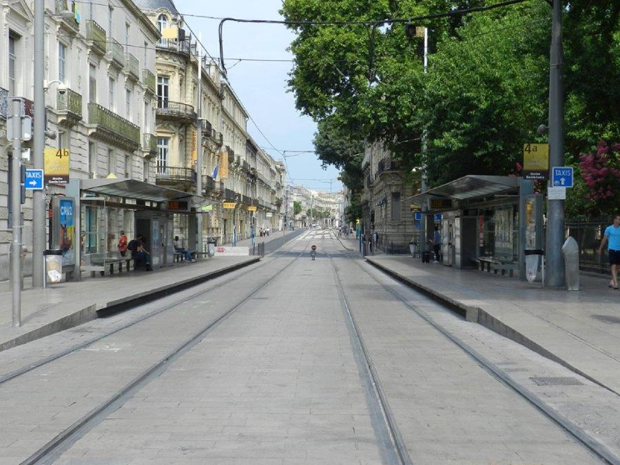 Station « Gare St-Roch » commune aux lignes 3 et 4 de tramway, rue de la République à Montpellier, des personnes semblent attendre un tramway qui ne passera pas, le dimanche 21 juillet 2019. Copyright : Anje34