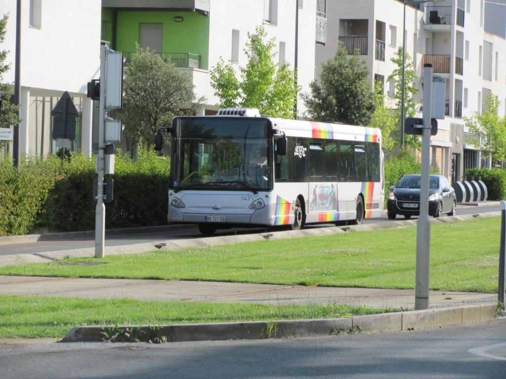 A Angers, le bus 543 GX 327 Heuliez, circulant en direction du centre-ville, est photographié, le dimanche 21 juillet 2019, peu de temps après la station « Terra Botanica », non desservie par les rames de tramway de la ligne A entre le lundi 1er juillet et le dimanche 25 août 2019. Copyright : Edouard Paris