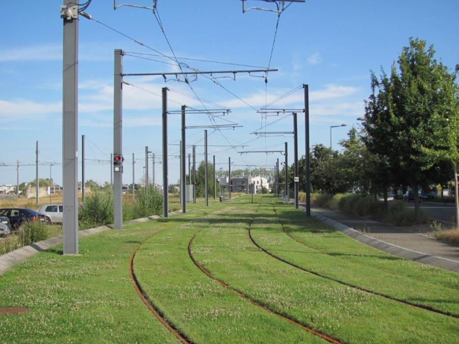 A Angers, plateforme engazonnée de la ligne A de tramway à la hauteur du Centre Technique des Transports (CTT) Raymond Perron photographiée le dimanche 21 juillet 2019. Copyright : Edouard Paris