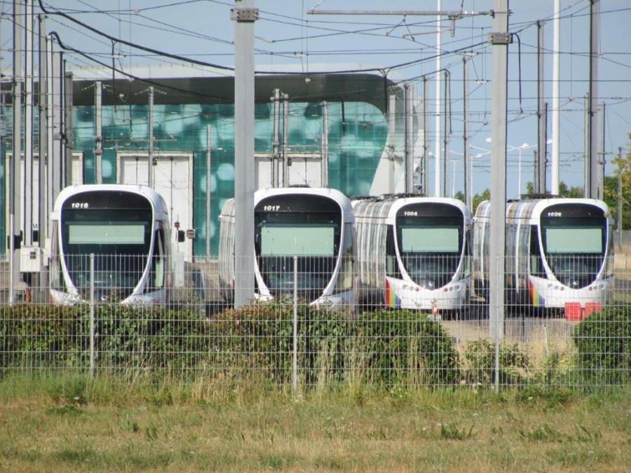 A Angers, photo de rames Citadis 302 Alstom garées sur le faisceau extérieur du Centre Technique des Transports (CTT) Raymond Perron, le dimanche 21 juillet 2019. Copyright : Edouard Paris