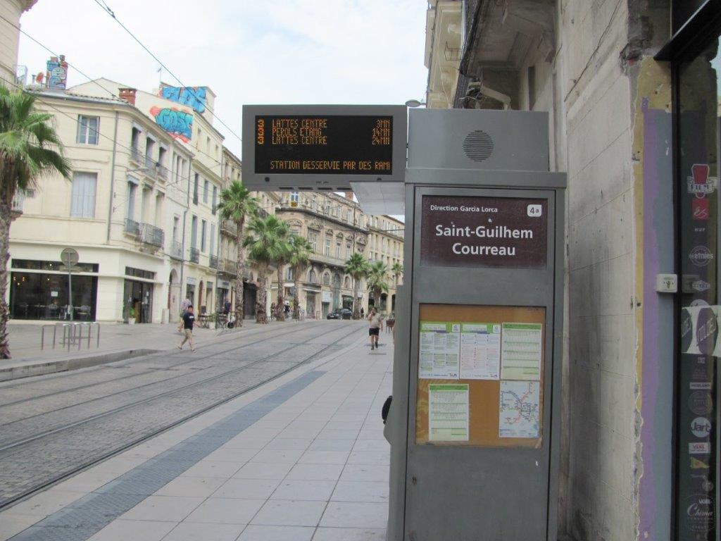 De la mi-juillet à la mi-août 2019, la station « Saint-Guilhem – Courreau », propre à la ligne 4, voit passer des rames opérant sur la ligne 3 dont l’itinéraire est temporairement modifié. Photo prise le samedi 27 juillet 2019. Copyright : Edouard Paris