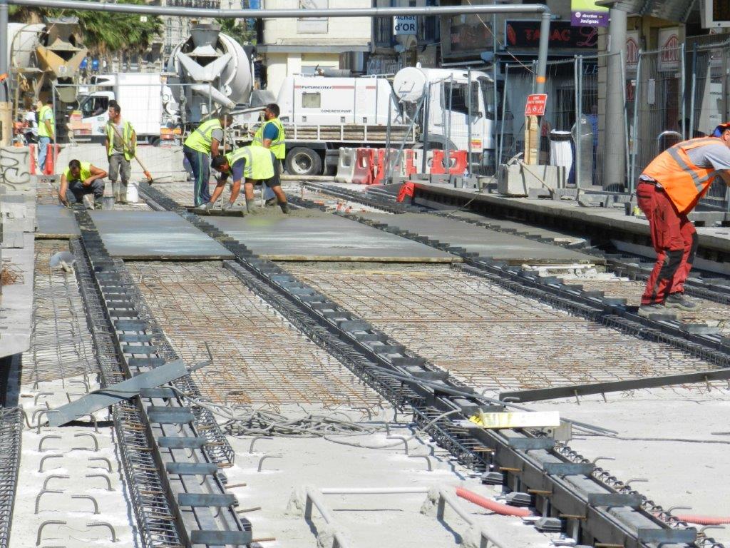 A la station « Observatoire » commune aux lignes 3 et 4 de tramway, travaux de coulage du béton désactivé, le jeudi 25 juillet 2019. Copyright : Anje34