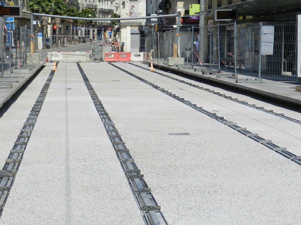 Station « Observatoire » commune aux lignes 3 et 4 de tramway, le béton désactivé a remplacé les pavés. Photos prise le dimanche 28 juillet 2019. Copyright : Anje34