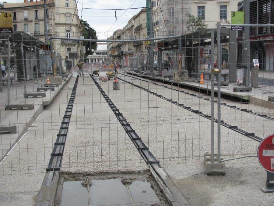 Vue sur la plateforme de la station « Observatoire », commune aux lignes 3 et 4 de tramway, recouverte de béton désactivé, le samedi 27 juillet 2019. Copyright : Edouard Paris