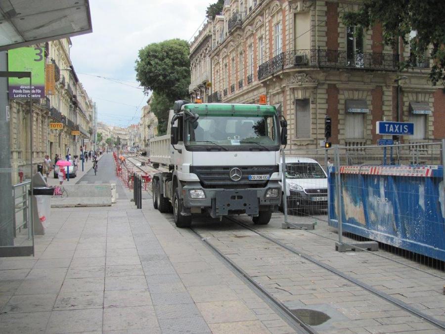 Les dalles de pierre déjointées de la station « Gare Saint-Roch », commune aux lignes 3 et 4, devraient laisser la place à un revêtement en béton désactivé. Photo prise le samedi 27 juillet 2019. Copyright : Edouard Paris