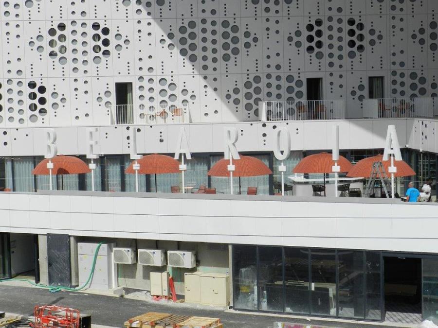Autre photo des lettres formant le nom BELAROIA fixées, chacune sur un support, le long du garde-corps de la terrasse du bar mixologie rattaché à l’hôtel Golden Tulip Montpellier Centre Belaroia, prise depuis la terrasse de la gare de Montpellier Saint-Roch, le jeudi 1er août 2019. Copyright : Anje34