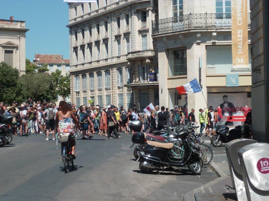Après un face à face de près de quinze minutes avec les forces de l’ordre, place des Martyrs-de-la-Résistance à Montpellier, les gilets jaunes repartent vers la place de la Comédie, le samedi 3 août 2019 à 15h14. Copyright : Edouard Paris