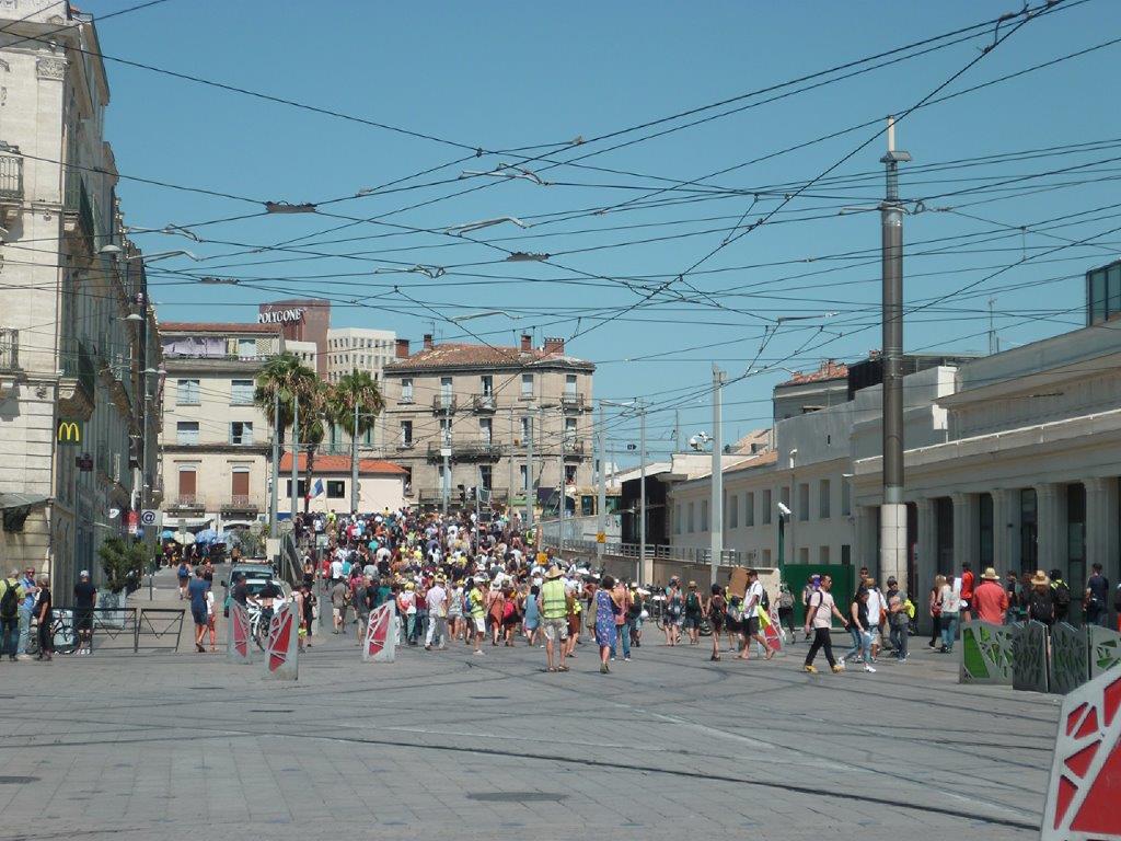 Rue Jules-Ferry à Montpellier, le cortège des gilets jaunes est en train de prendre la direction de l’hôtel de police de Montpellier, le samedi 3 août 2019 à 15h29. Copyright : Edouard Paris