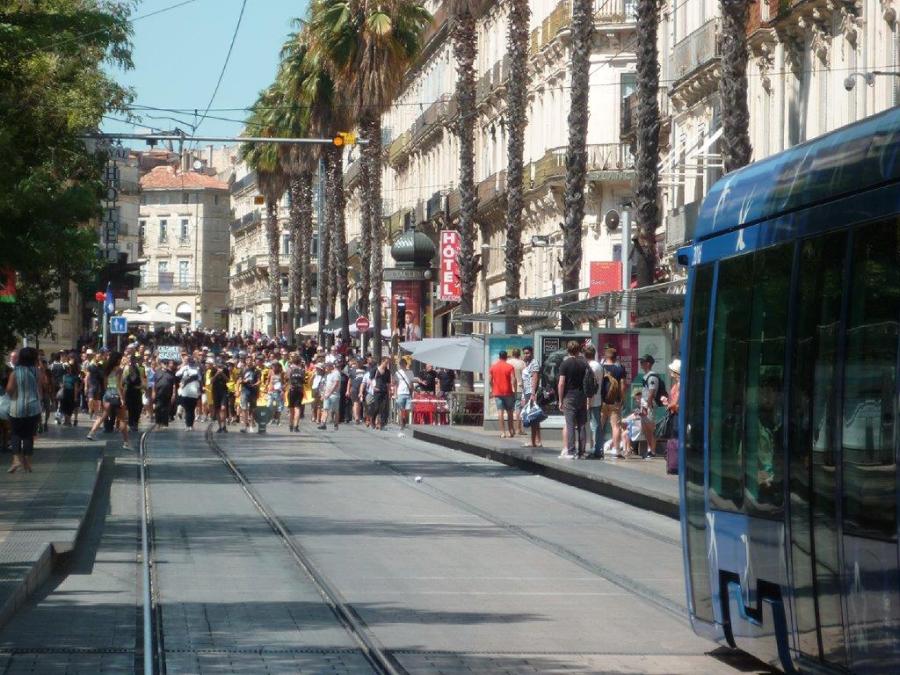 Acte XXXVIII des gilets jaunes à Montpellier, le cortège descend la rue Maguelone en direction de la gare de Montpellier Saint-Roch, le samedi 3 août 2019 à 15h25. Copyright : Edouard Paris