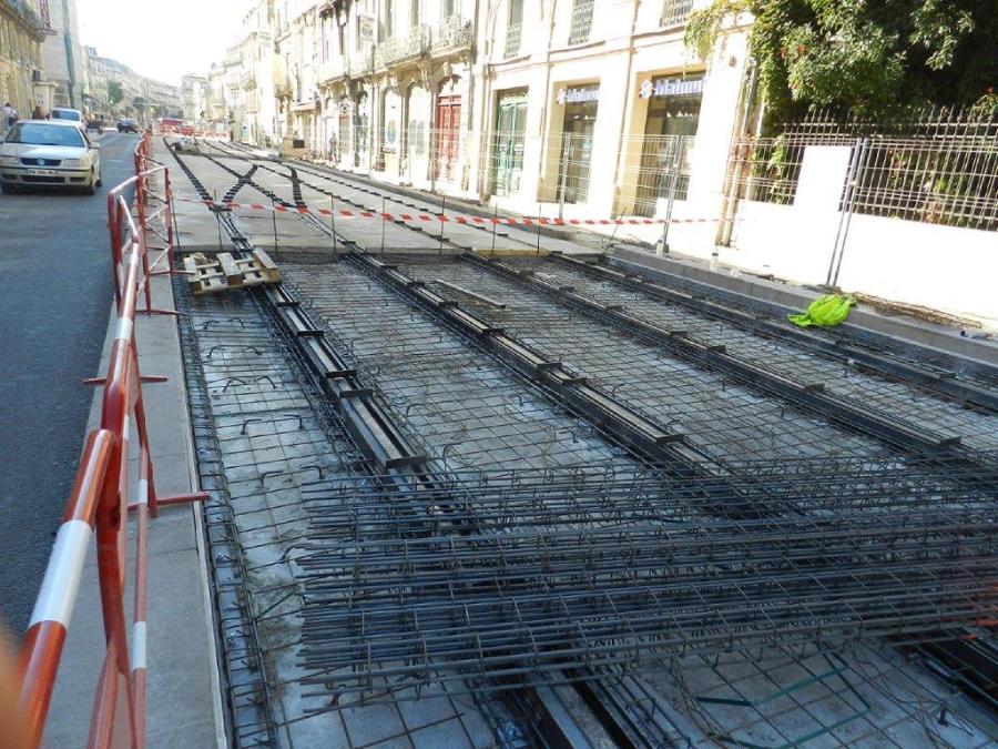 Aperçu du chantier de réfection du revêtement de la plateforme du tramway commune aux lignes 3 et 4 sur la partie centrale de la rue de la République, le vendredi 2 août 2019. Copyright : Anje34
