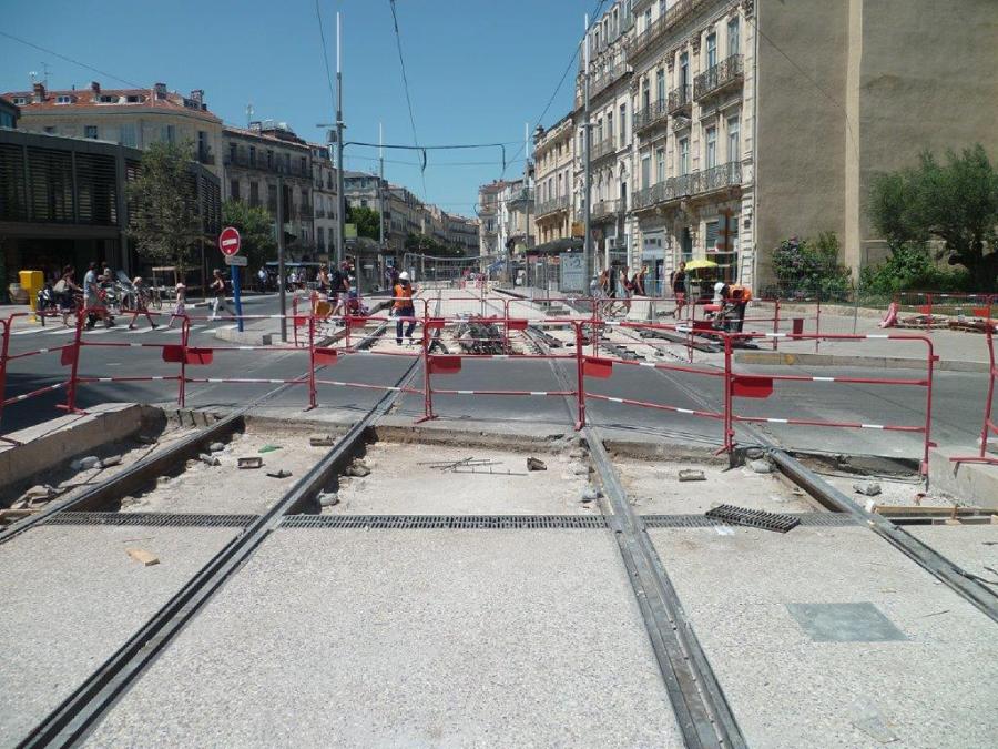Aperçu du chantier de réfection du revêtement de la plateforme du tramway commune aux lignes 3 et 4 à la jonction du boulevard de l’Observatoire et de la rue de la République, le samedi 3 août 2019. Copyright : Edouard Paris