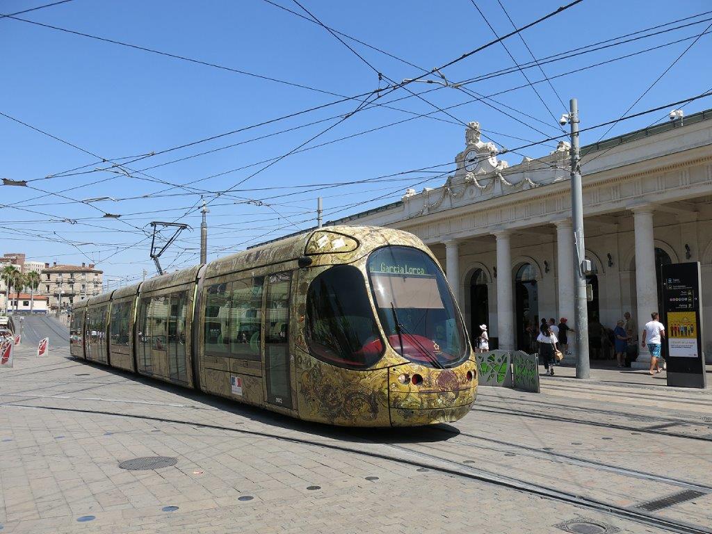 Venant de la rue du Pont-de-Lattes et circulant dans le sens 4b, la rame 2042 Citadis 302 Alstom est photographiée place Auguste-Gibert à Montpellier, le jeudi 1er août 2019. Copyright : jean-pierre autié