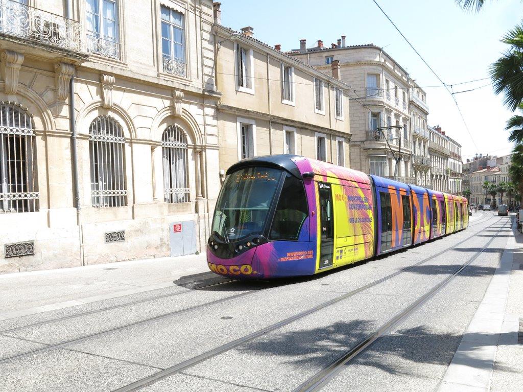 La rame 2099 Citadis 402 multiligne à la livrée « MOCO », opérant sur la ligne 3, est photographiée boulevard Ledru-Rollin à Montpellier, entre les stations « Saint-Guilhem – Courreau » et « Peyrou – Arc de Triomphe », le jeudi 1er août 2019. Copyright : jean-pierre autié