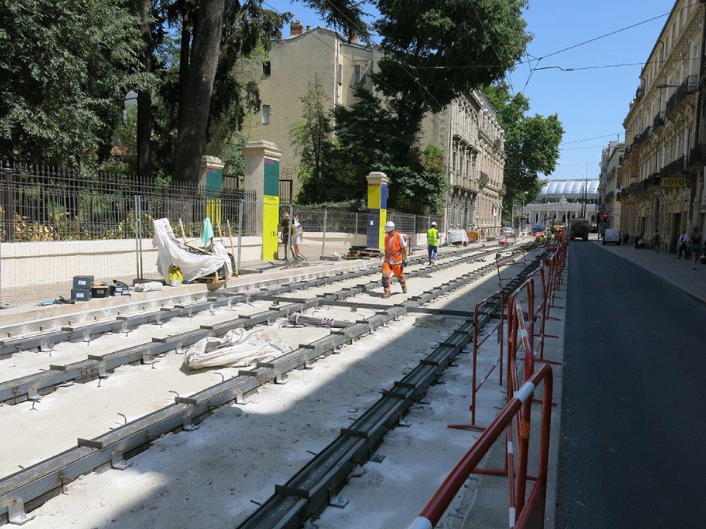 Rue de la République à Montpellier, aperçu du chantier de réfection du revêtement de la plateforme du tramway commune aux lignes 3 et 4 à la hauteur de l’entrée du MOCO, le jeudi 1er août 2019. Copyright : jean-pierre autié