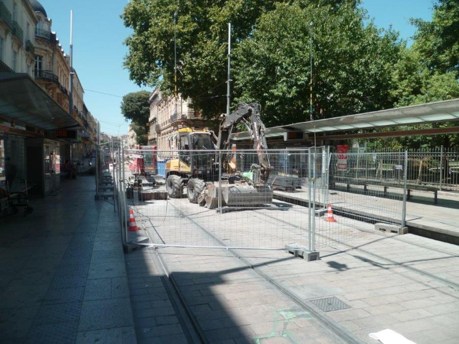 Pendant les travaux de réfection du revêtement de la plateforme du tramway commune aux lignes 3 et 4, boulevard de l’Observatoire et rue de la République, les engins de chantier et une partie du matériel sont remisés dans un enclos situé sur les voies de la station « Gare Saint-Roch » des lignes 3 et 4. Photo prise le samedi 3 août 2019. Copyright : Edouard Paris