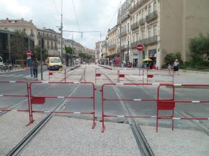 - Travaux de réfection du revêtement de la plateforme du tramway commune aux lignes 3 et 4, dans le bas de la rue de la République, le mercredi 7 août 2019. Copyright : Anje34