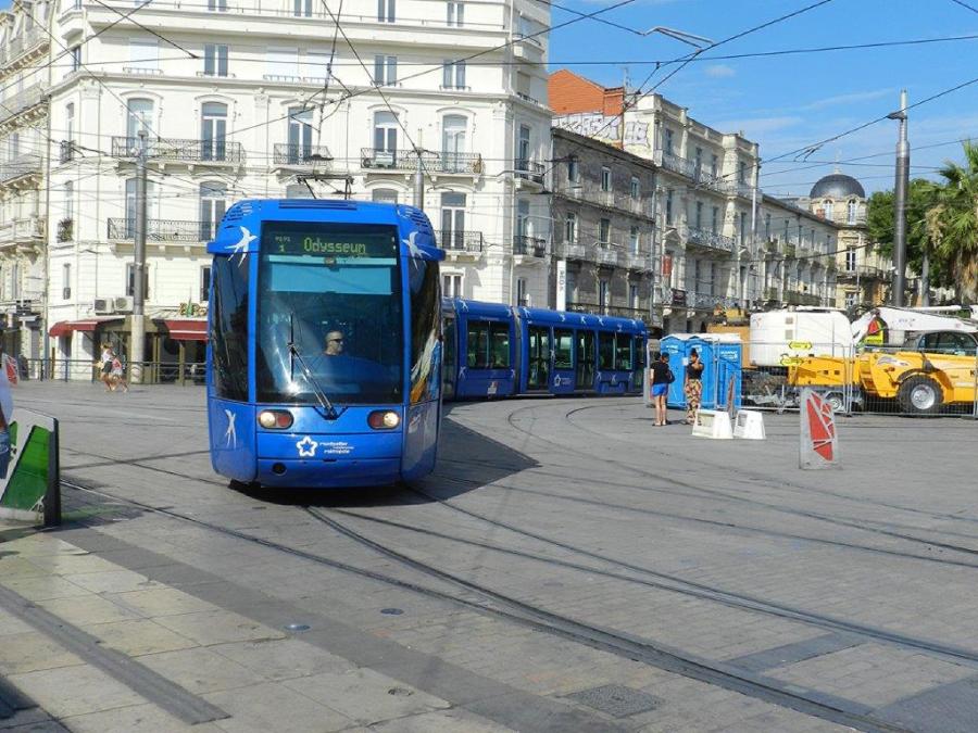 La rame 2004 Citadis 401 Alstom, opérant sur la ligne 1 à destination du terminus « Odysseum », est photographiée sur la place Auguste-Gibert juste après avoir quitté la station « Gare Saint-Roch » (rue de la République) commune aux lignes 3 et 4, le lundi 12 août 2019. Copyright : Anje34