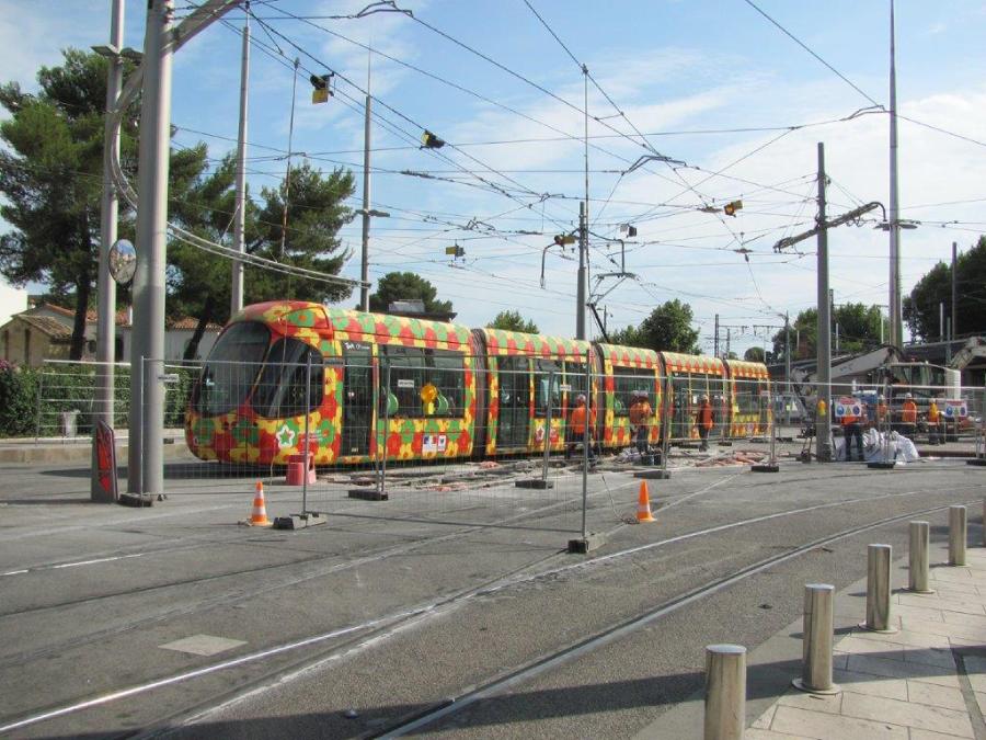 Place du 11 Novembre à Montpellier, la rame 2061 Citadis 302 Alstom, opérant sur la ligne 2 à destination du terminus « Saint Jean de Védas – Centre », longe le chantier de rénovation de la voie ferrée avant de prendre la direction du quartier des Aubes, le lundi 12 août 2019. Copyright : Edouard Paris