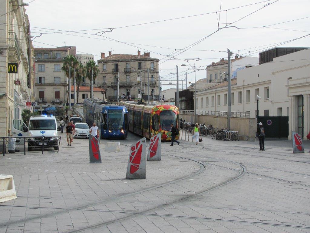 Rue Jules-Ferry à Montpellier, une rame Citadis 401 Alstom bleue aux hirondelles de la ligne 1 croise une rame Citadis 302 Alstom fleurie de la ligne 1, le lundi 12 août 2019. Copyright : Edouard Paris