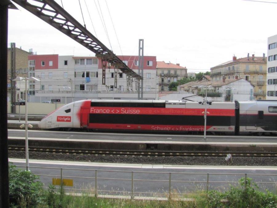 Motrice de queue de la rame 4725 Euroduplex 3UA, revêtue de la nouvelle livrée TGV Lyria, photographiée en gare de Montpellier Saint-Roch, le lundi 12 août 2019 à 11h46, assurant le TGV 6203 Paris gare de Lyon – Perpignan. Copyright : Edouard Paris