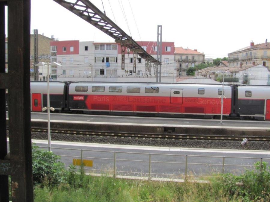 Voiture bar de la rame 4725 Euroduplex 3UA, revêtue de la nouvelle livrée TGV Lyria, photographiée en gare de Montpellier Saint-Roch, le lundi 12 août 2019 à 11h46, TGV 6203 Paris gare de Lyon – Perpignan. Copyright : Edouard Paris