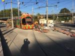 - Vue sur le chantier de rénovation de la voie ferrée du tramway place du 11 Novembre à Montpellier, le lundi 12 août 2019 en fin d’après-midi, devant lequel passe la rame 2052 Citadis 302 Alstom qui prend la direction du quartier des Aubes. Copyright : En passant par là