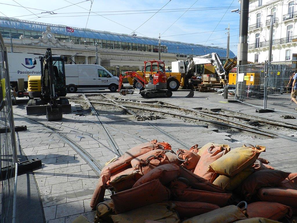 Autre aperçu du chantier de rénovation de la voie ferrée du tramway, place Auguste-Gibert à Montpellier, côté rue Maguelone, le mardi 13 août 2019. Copyright : Anje34