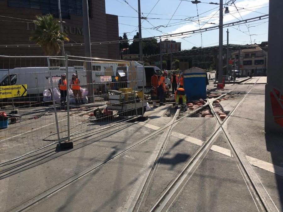 Vue à contre-jour du chantier de rénovation de la voie ferrée du tramway place du 11 Novembre à Montpellier, le lundi 12 août 2019 en fin d’après-midi. Copyright : En passant par là