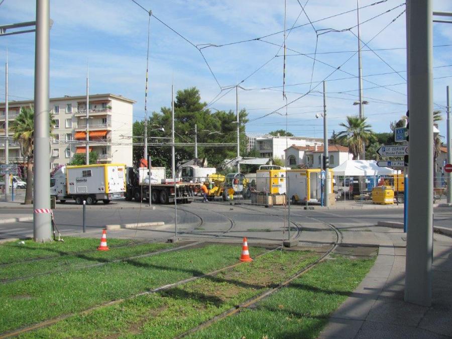 Autre vue sur le chantier de rénovation de la voie ferrée du tramway place du 11 Novembre à Montpellier, le lundi 12 août 2019 en milieu de matinée. Copyright : Edouard Paris