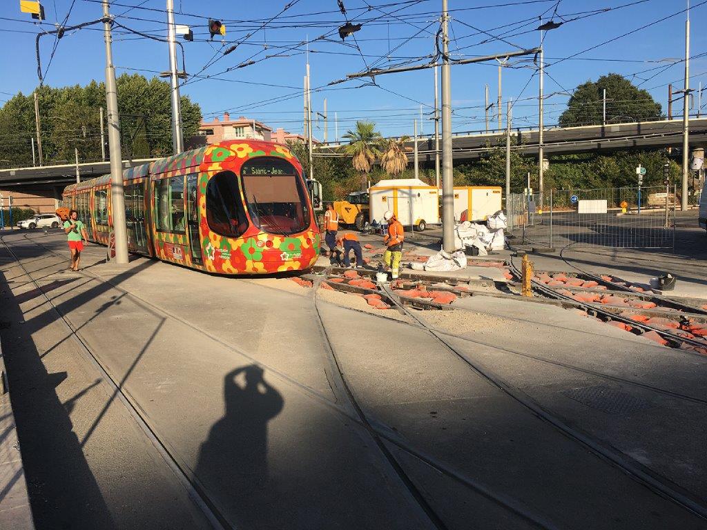 Vue sur le chantier de rénovation de la voie ferrée du tramway place du 11 Novembre à Montpellier, le lundi 12 août 2019 en fin d’après-midi, devant lequel passe la rame 2052 Citadis 302 Alstom qui prend la direction du quartier des Aubes. Copyright : En passant par là