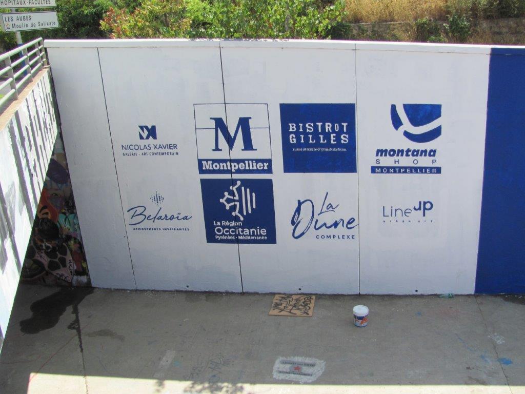 Logos des partenaires financiers du festival marquant le 30e anniversaire des premiers graffiti à Montpellier. Photo prise le mercredi 14 août 2019. Copyright : Edouard Paris