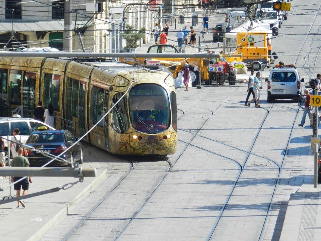 Vue sur la place Auguste-Gibert à Montpellier sur laquelle circule une rame Citadis 302 Alstom opérant sur la ligne 4 dans le sens b, le vendredi 16 août 2019. Copyright : Anje34