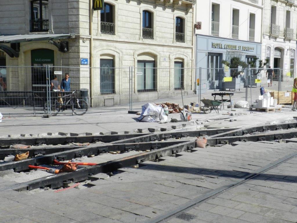 Vue sur un appareil de voie rénové à la jonction de la place Auguste-Gibert et de la rue Jules-Ferry à Montpellier, le vendredi 16 août 2019. Copyright : Anje34