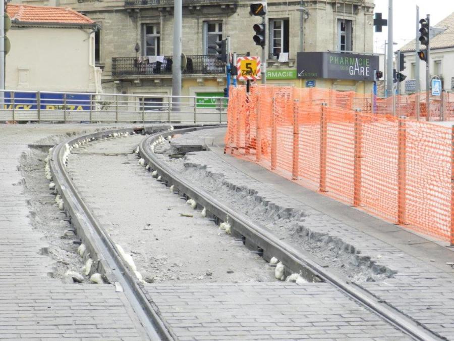 Vue sur la plateforme du tramway, rue Jules-Ferry à Montpellier, où les pavés ont été déposés. Photo prise le dimanche 18 août 2019. Copyright : Anje34