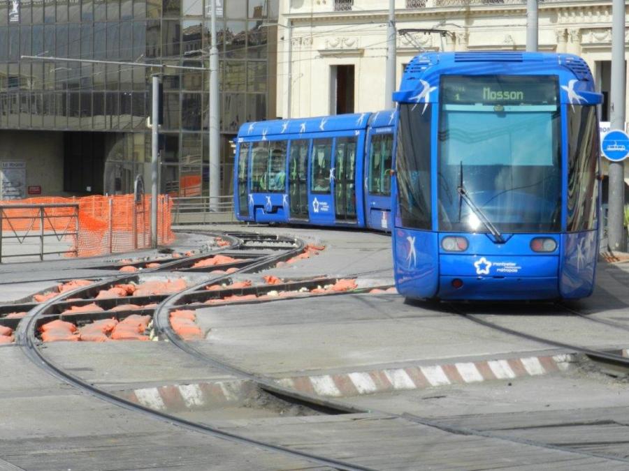 La rame 2020 Citadis 401 Alstom, opérant sur la ligne 1 à destination du terminus « Mosson », passe le long de la voie ferrée renovée à la jonction de la rue Jules-Ferry, du Pont-de-Lattes et de l’avenue Henri-Frenay, d’où est prise la photo, le dimanche 18 août 2019. Copyright : Anje34