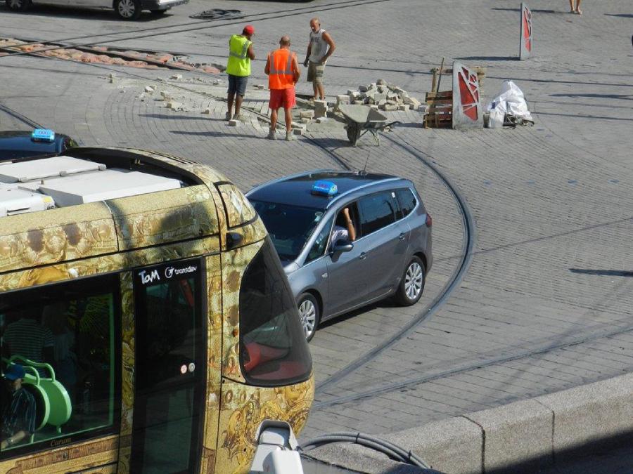 Reconstitution partielle du revêtement de la plateforme du tramway, place Auguste Gibert à Montpellier, côté rue de la République, après des travaux de rénovation de la voie ferrée. Photo prise le jeudi 25 juillet 2019. Copyright : Anje34